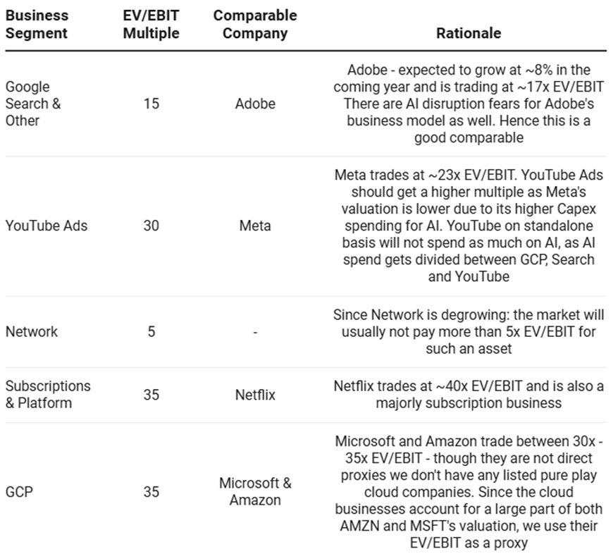 I use a comparable analysis, which is like valuing a house based on the price per square foot of similar homes in the same neighbourhood. This method allows me to benchmark each of Alphabet's segments against similar, publicly traded companies.