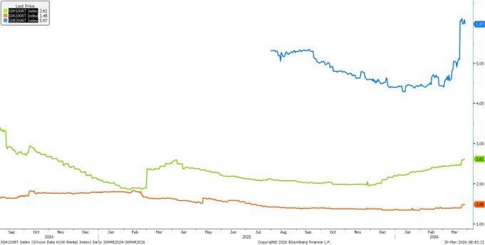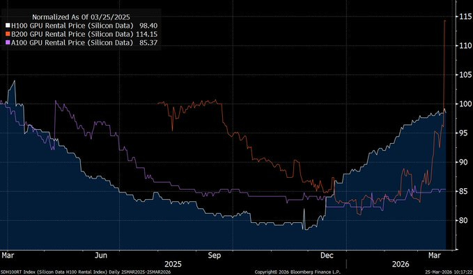 The price of compute has gone up materially since the start of 2026, following the latest viral Copilot Cowork and other enterprise use cases, such as coding and agentic workflows. The TAM for AI is not just about increasing workers’ efficiency but also about adding agentic knowledge workers (essentially, the TAM is much larger for agents than it was for training models). And Nvidia’s GPUs turn electricity into autonomously working agents! The market is underestimating the demand for compute once agentic AI takes off. 2026 is the year in which this massive change plays out. The market is too distracted by the war to realize this.