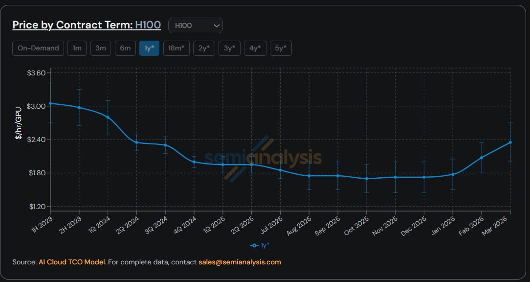 Edit: A day after our Nvidia notes were released, SemiAnalysis made the following pricing graphs public. Their data is further proof of our thesis that compute demand is inflecting, and we are in the midst of a compute shortage - which will directly result in higher revenues for Nvidia.